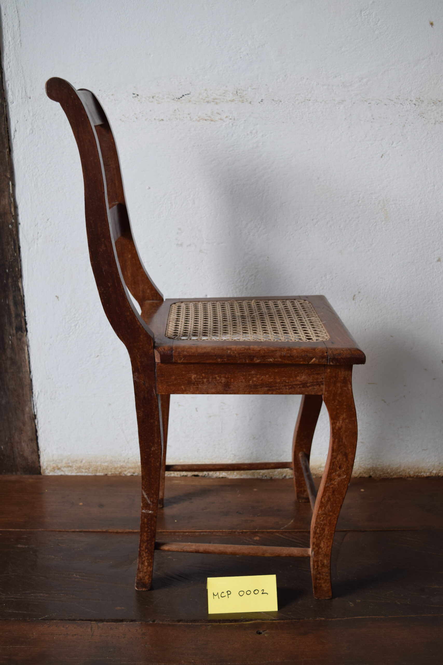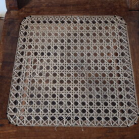 Peça em madeira escura, envernizada. Assento quadrado, com tela sextavada de fibra natural ao centro. Possui quatro pernas entalhadas de forma curva, com quatro faces cada, tendo três traves entre elas de madeira cilindrica. O encosto possui duas hastes entalhadas unidas por duas traves.