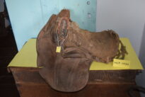 Objeto utilizado para montaria, porém apenas por mulheres. É formada por uma cobertura de couro em cor escura encimada por parte acolchoada composta por algodão e juta, de formato curvilíneo, na parte anterior possui estrutura sobressalente com curvatura para a direita de que monta) em tecido (nas cores vermelho e branco, predominando a primeira cor) e couro com acolchoamento com predominância na cor escura; composta por 02 blocos de madeira retos e estreitos para a sustentação, sendo duas retas, retangulares, formando um "V" invertido e revestidas de tecido nas cores azul e branco. Algumas alças de couro estão fixas na parte inferior da peça e possuem tamanhos e formatos variados (duas em peças únicas, uma delas mais larga que a outra), outra formada por peça única, porém com recorte ao meio e unidas em sua base e outra com argola redonda e metálica na sua extremidade.